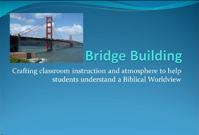 “Teaching a Biblical worldview to students of other faiths can feel like spanning a divide between two continents. Consider worldview building–Bridge Building. You are not preaching the gospel or giving invitations in academic courses but you are making a way for them to visit, understand, and appreciate a significant alternative way to see the world.”